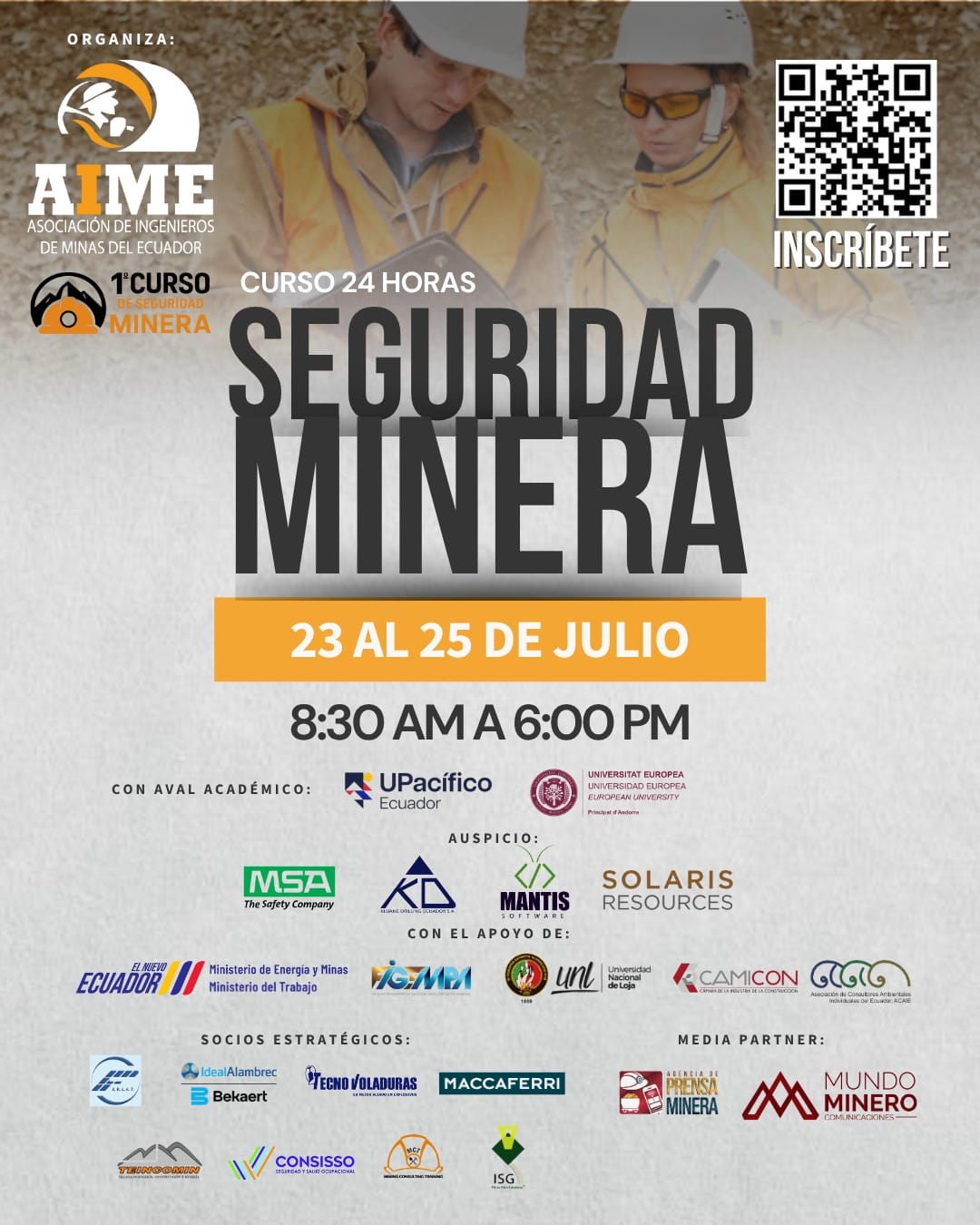 La Asociación de Ingenieros de Minas del Ecuador (AIME), bajo el liderazgo de su presidente, el Ing. Flavio Granizo, anuncia la realización del 1.er Curso Nacional de Seguridad Minera, que se llevará a cabo del 23 al 25 de julio en la ciudad de Quito.