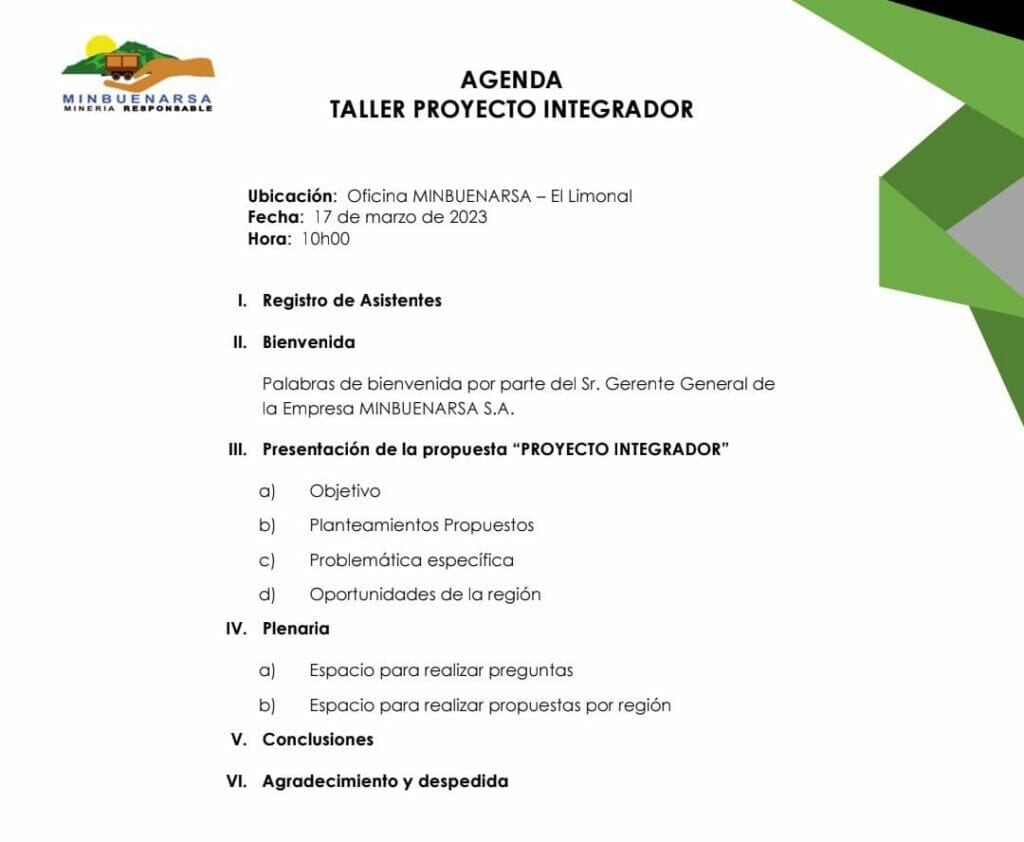 La empresa minera Buenos Aires S.A. (MINBUENARSA) realizará un taller de proyecto integrador, dirigido a representantes y autoridades electas de las juntas parroquiales de Imbabura, este 17 de marzo de 2023, en las oficinas de la empresa ubicadas en el sector El Limonal.