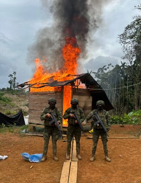 El Ejército Ecuatoriano llevó a cabo una operación en la parroquia 5 de Junio, cantón San Lorenzo, provincia de Esmeraldas, donde logró desarticular un campamento y maquinaria empleada para actividades de minería ilegal en la zona.