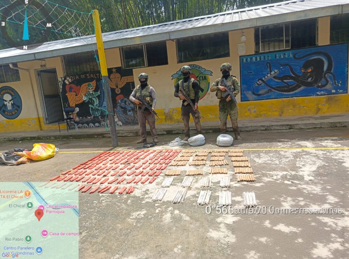 Durante la intervención, el personal militar localizó una importante cantidad de material explosivo y equipos utilizados para estas operaciones ilícitas. Entre lo decomisado constan 436 unidades de explogel, 1.200 metros de mecha lenta, 21 metros de mecha lenta con cápsulas, 49 tacos de ANFO, 200 libras adicionales de este mismo explosivo, así como 20 generadores eléctricos, cuatro rotomartillos, 30 litros de gasolina, 500 sacos de material aurífero, tres poleas y siete fraguas.