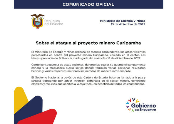 Por primera vez desde la creación del prometedor Decreto 151 de priorizar y desarrollar una minería responsable ambiental y socialmente, el Ministerio de Energía y Minas, solo bajo la gestión del actual ministro Fernando Santos, muestra una posición empática con el sector minero, por su rechazo a los actos violentos perpetrados en contra del proyecto minero Curipamba, del cantón Las Naves, provincia de Bolívar, la madrugada del 14 de diciembre de 2022.