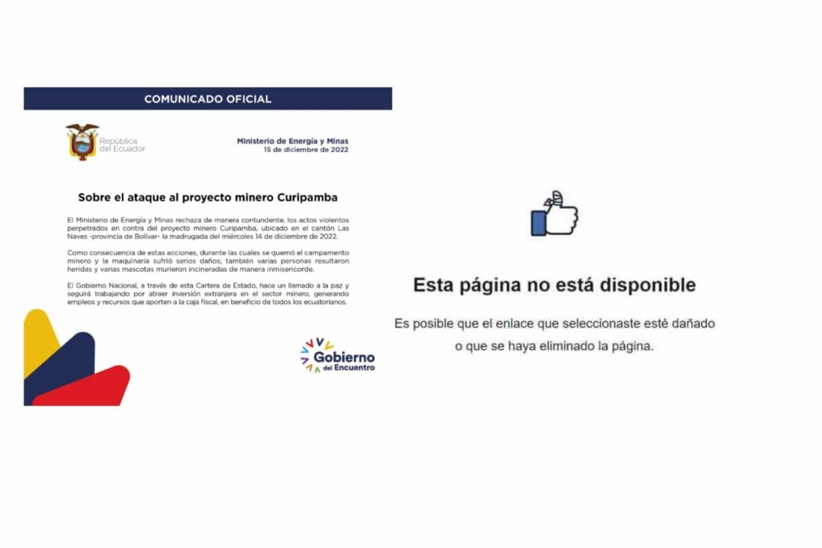 El oportuno comunicado oficial publicado por el Ministerio de Energía y Minas, en rechazo absoluto sobre el ataque registrado el 14 de diciembre en el campamento perteneciente a la empresa minera Curimining, en el sector de Selva Alegre del cantón Las Naves, provincia de Bolívar, de manera inexplicable fue eliminado de las cuentas oficiales de la Cartera de Estado.