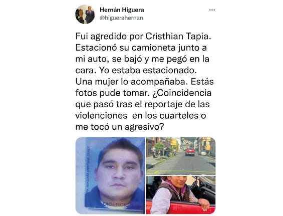 Higuera, fue víctima de la desenfrenada y desatendida violencia que vive el país, pues según el periodista, su agresor estacionó su camioneta junto a su auto, se bajó y sin dudar lo golpeó directamente en la cara.