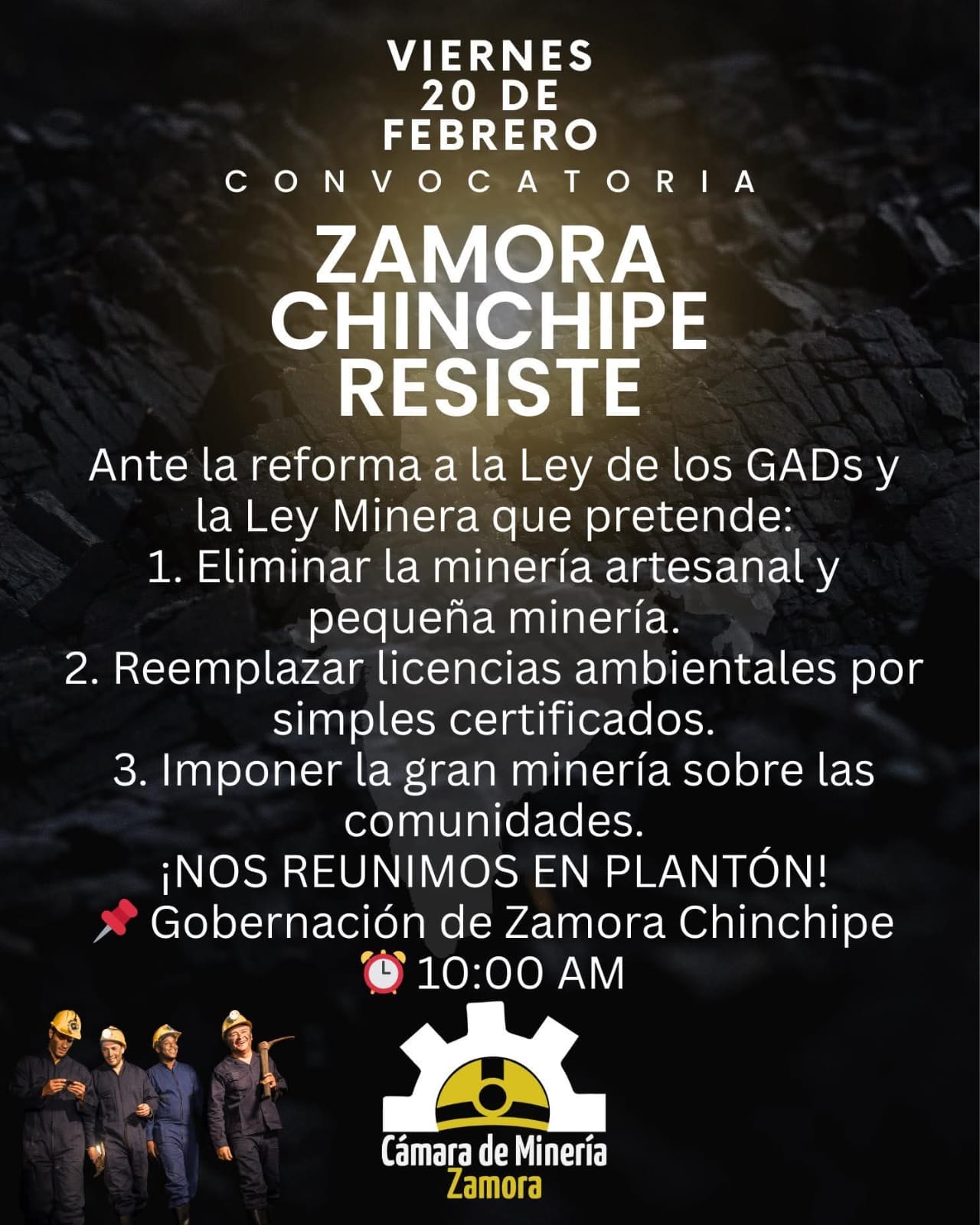El llamado ha sido difundido por la Cámara de Minería de Zamora, que invita a trabajadores, familias mineras y ciudadanía en general a sumarse al plantón pacífico. En el material promocional se destaca la importancia de la actividad minera para la economía local y el sustento de cientos de familias en la provincia.